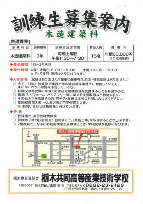 働きながら建築の高度な技能の習得を目指す、栃木県知事認定の職業訓練施設が訓練生を募集しています