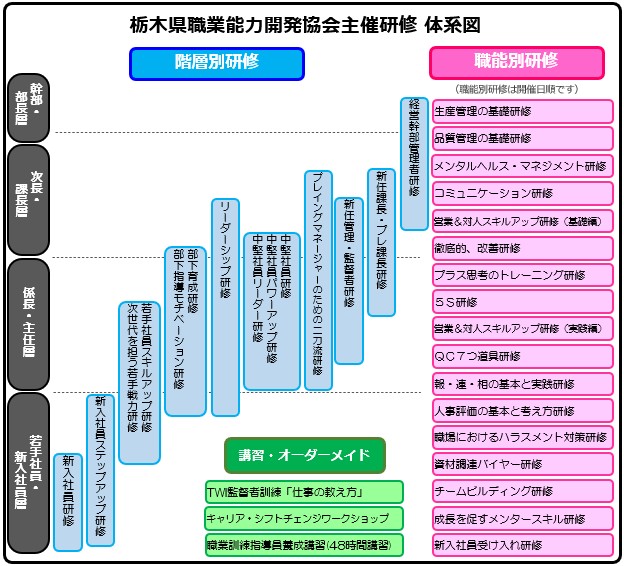 当協会では、事業内職業能力開発計画に沿った、人材育成のお手伝いができますよう、体系的にコースをご用意いたしました。